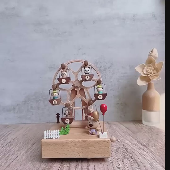Faites tourner la magie avec cette boîte à musique Carrousel Musical grande roue en bois, un objet à la fois décoratif et enchanteur qui émerveille enfants et adultes dès le premier regard. Inspirée de l’univers tendre des fêtes foraines, cette grande roue animée, décorée de motifs animaliers, diffuse une mélodie douce qui invite à la rêverie. Grâce à son mécanisme à bobine mécanique, elle fonctionne sans pile ni électricité, et s’anime dès que vous la remontez manuellement. Une touche poétique à poser dans une chambre, un salon ou sur une étagère.
